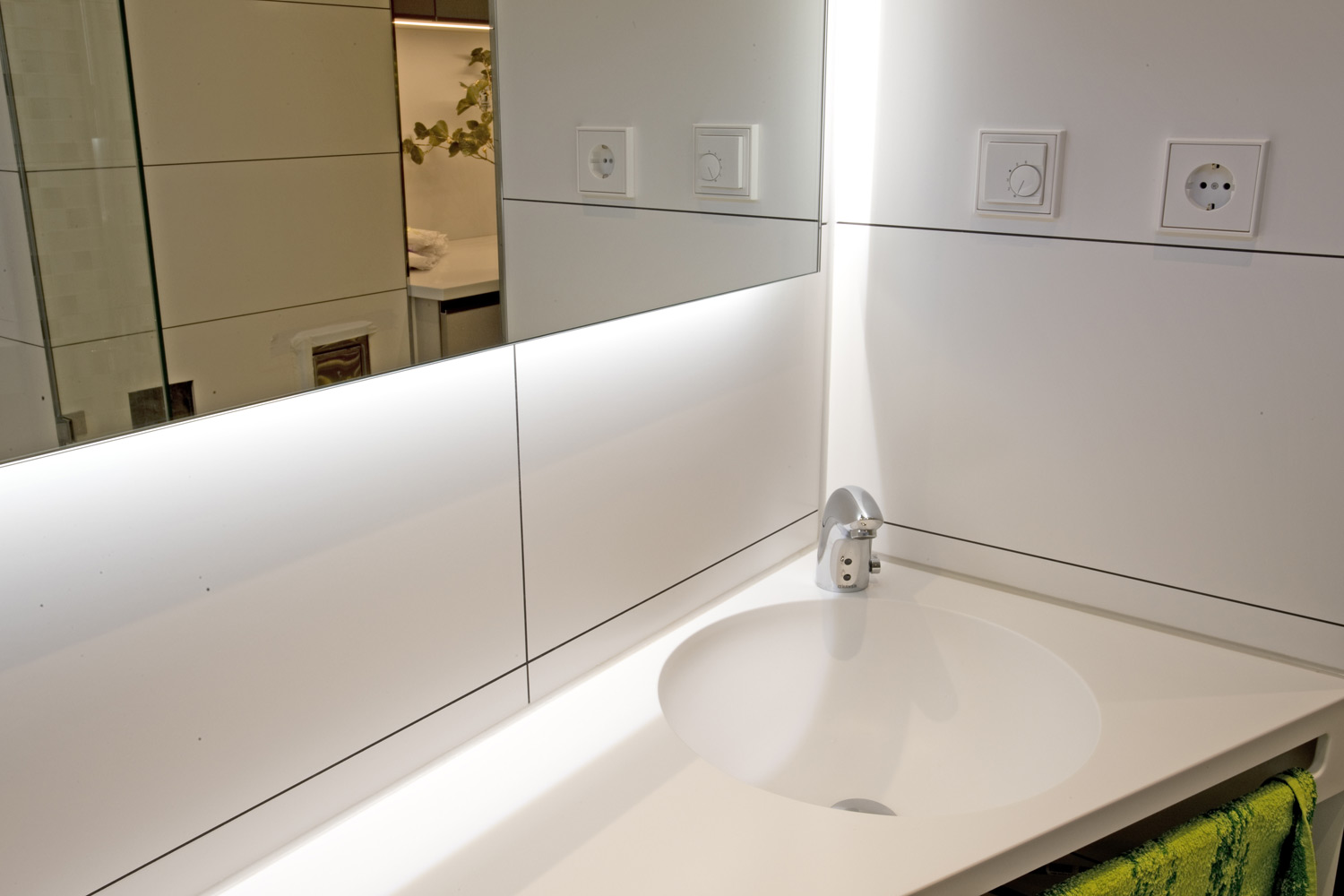 In die bodengleiche Dusche wurde ein fugenloser Duschsitz integriert. Ein Dusch- WC und die Maßanfertigung des Waschtisches passen sich in den Raum optimal ein. Die farbliche Gestaltung des Einbau-Badmöbels ist ähnlich der Glas- Mosaikfliesen. In dem Badmöbel ist eine Waschmaschine versteckt.