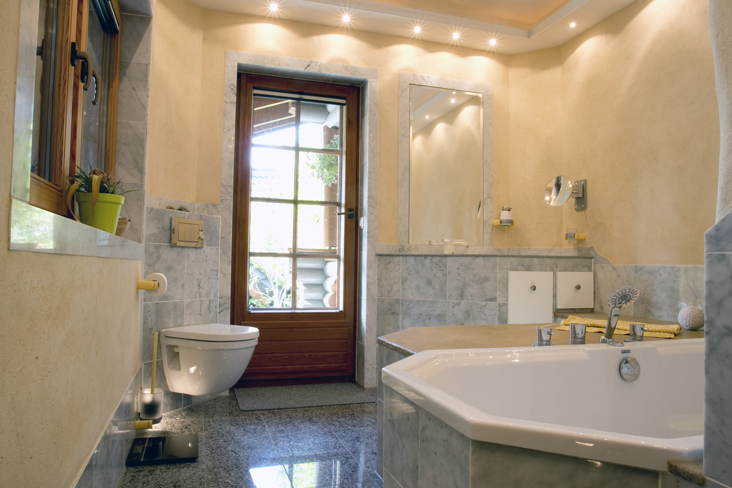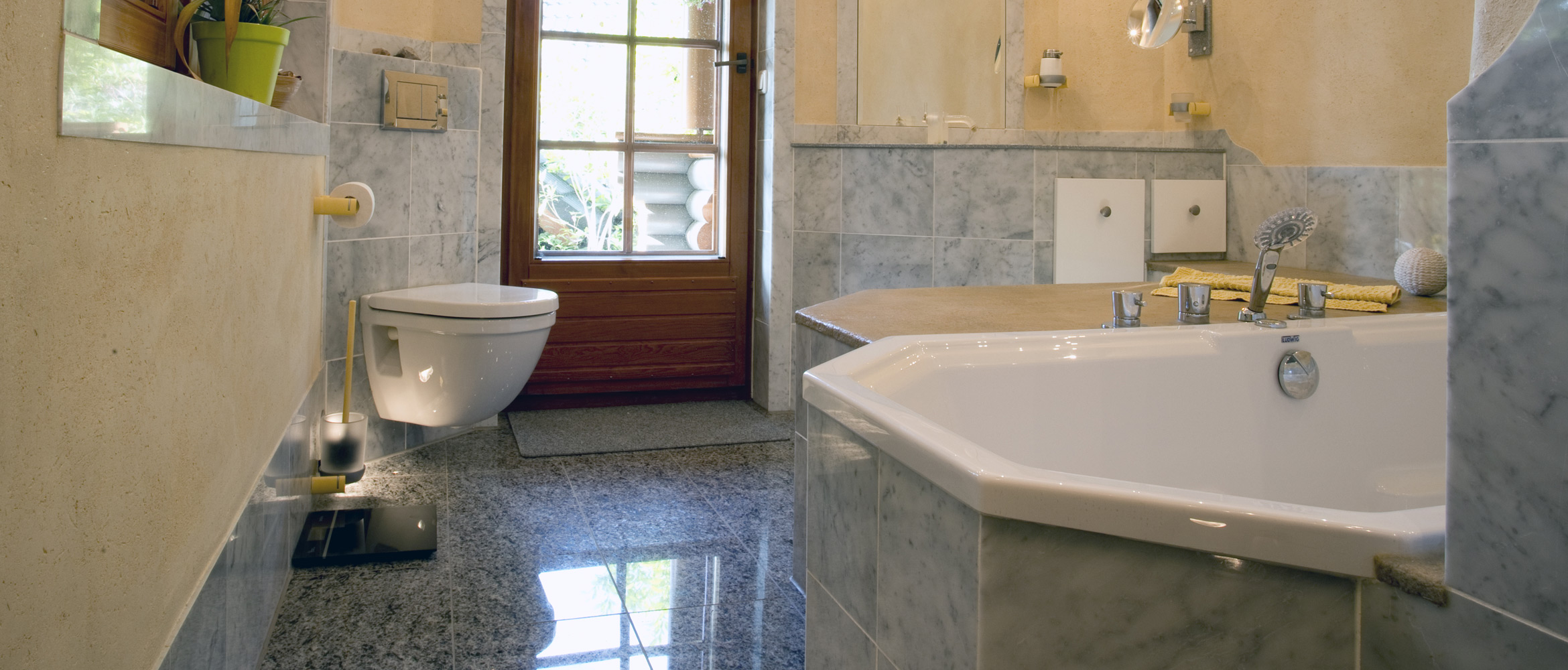 Das Wasser für die Badewanne kommt von der Decke. Marmor, Granit und die mit Lehmtafeln verkleideten Wände und Decke, lassen ein besonderes Klima entstehen. In der geschlossen Dusche, die auch als Dampfsauna funktioniert, entsteht beim duschen sofort ein wohliges Gefühl, weil es nicht zieht.