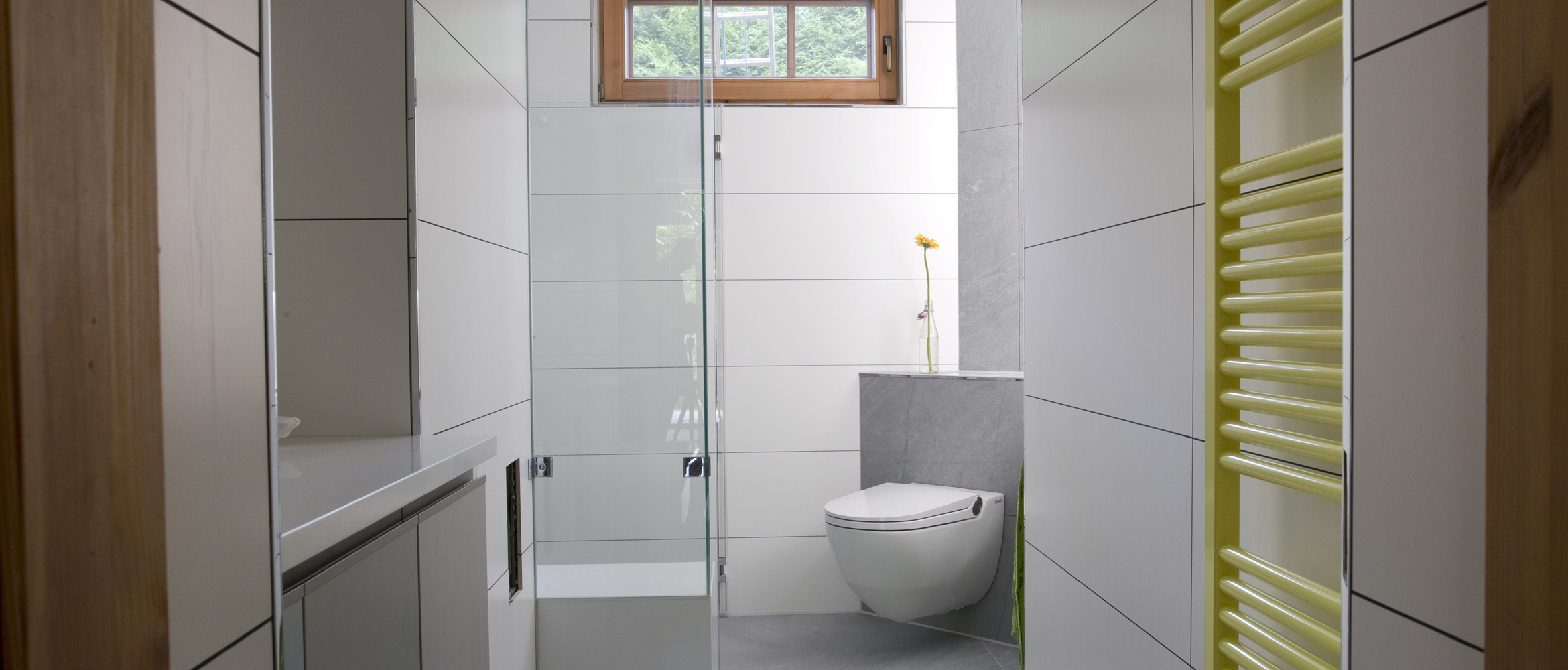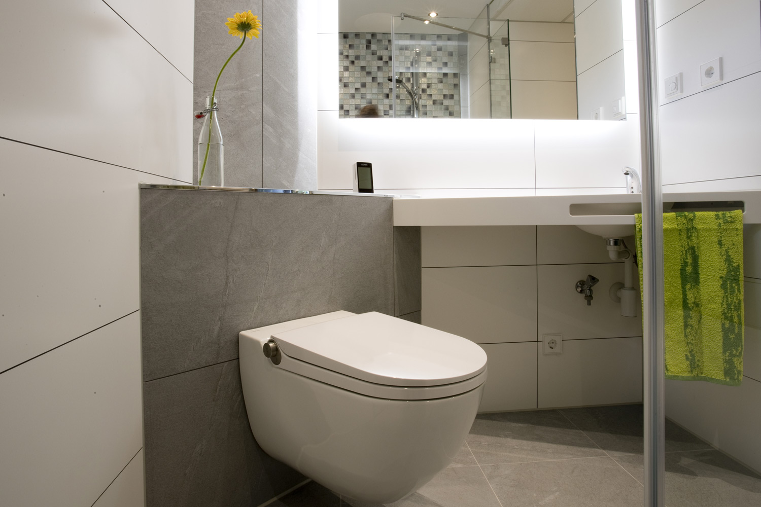 In die bodengleiche Dusche wurde ein fugenloser Duschsitz integriert. Ein Dusch- WC und die Maßanfertigung des Waschtisches passen sich in den Raum optimal ein. Die farbliche Gestaltung des Einbau-Badmöbels ist ähnlich der Glas- Mosaikfliesen. In dem Badmöbel ist eine Waschmaschine versteckt.