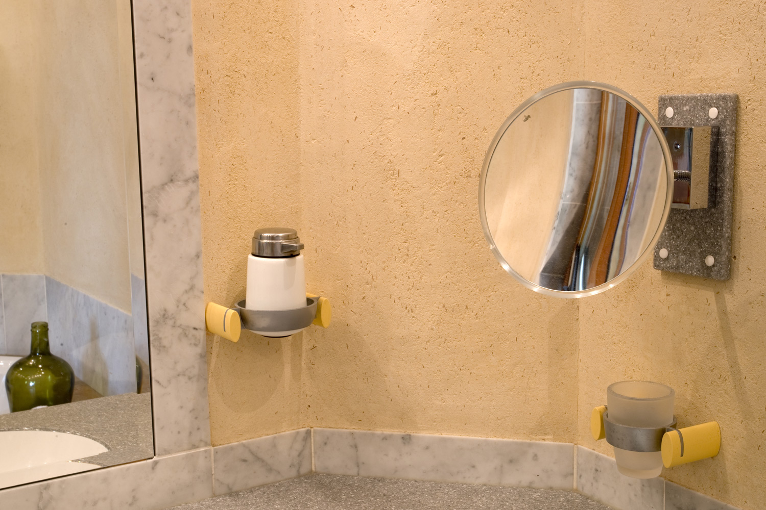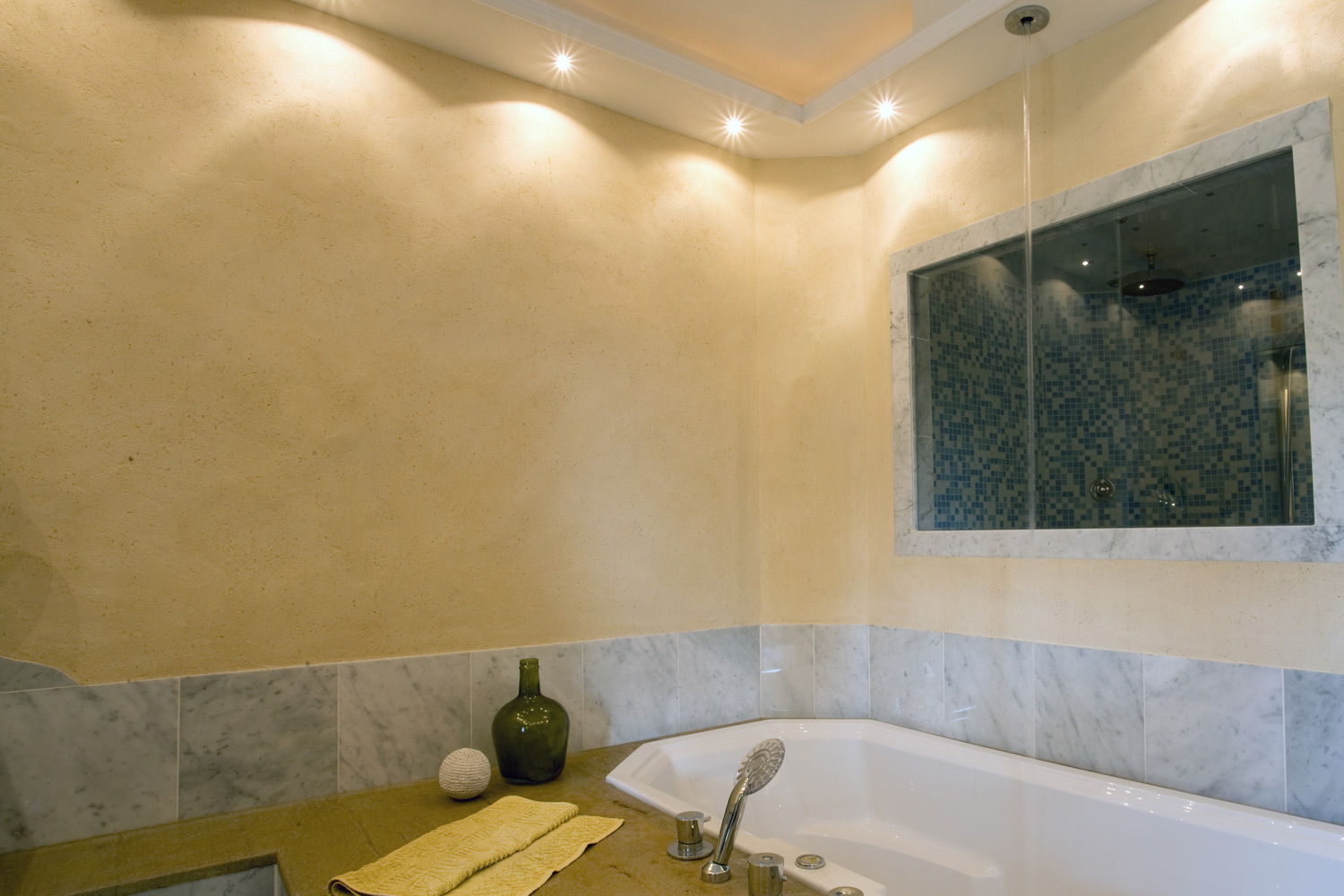 Das Wasser für die Badewanne kommt von der Decke. Marmor, Granit und die mit Lehmtafeln verkleideten Wände und Decke, lassen ein besonderes Klima entstehen. In der geschlossen Dusche, die auch als Dampfsauna funktioniert, entsteht beim duschen sofort ein wohliges Gefühl, weil es nicht zieht.